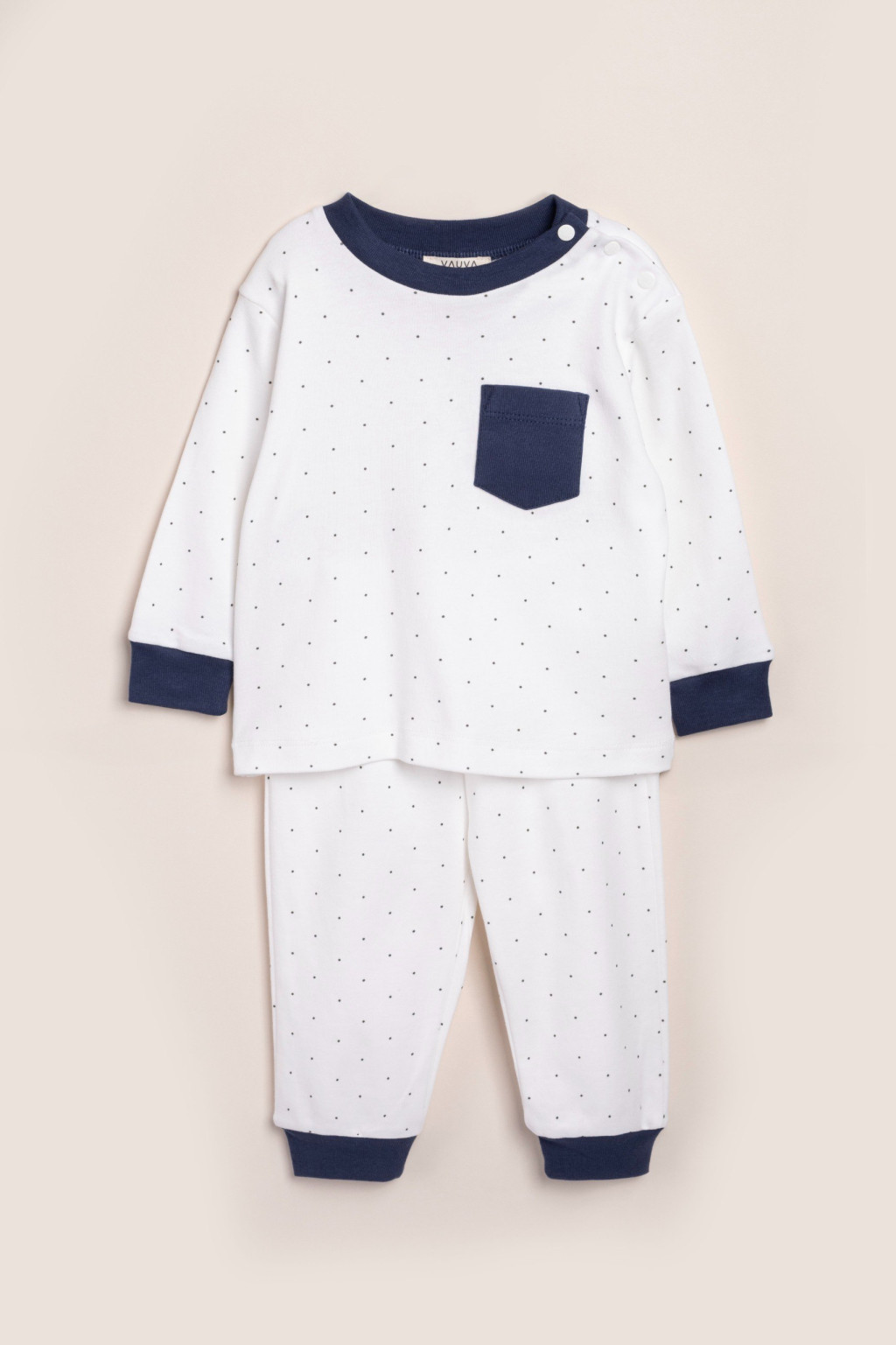 Apró mintás baba pizsama, vállon patentos, hosszú ujjú felsőrésszel és passzés nadrággal. A felsőt mellzseb és kontrasztos nyak-, ujj- és szárvég díszíti. Fehér - barna színben is elérhető.