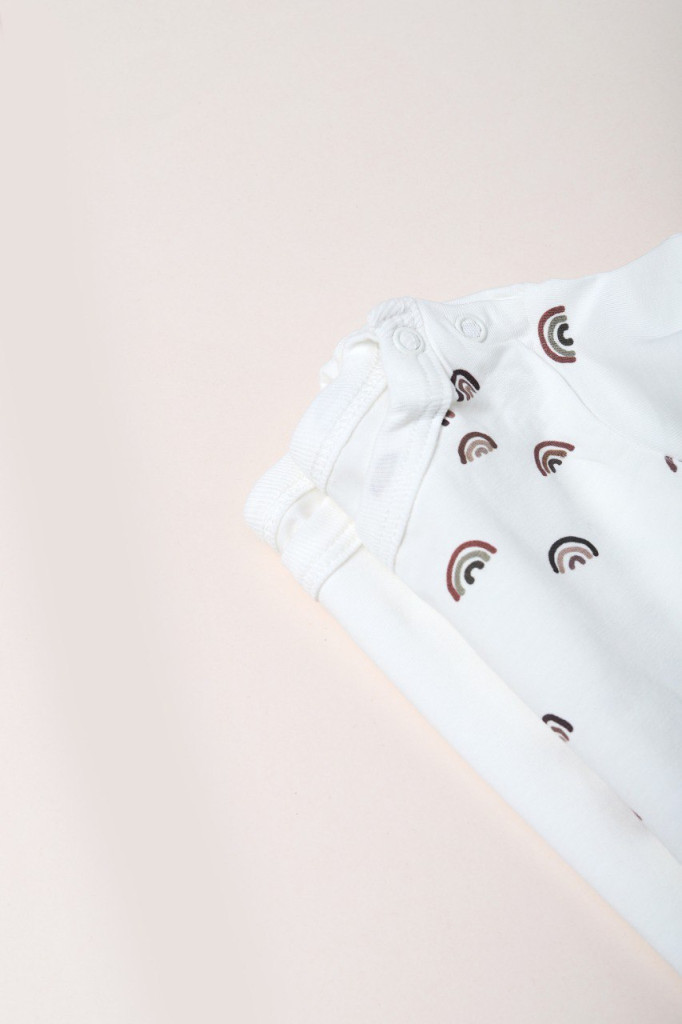 2 darabos, hosszú ujjú kombidressz szett (1 fehér, 1 szivárvány mintás), 100 % pamut anyagból, nikkelmentes patentokkal.