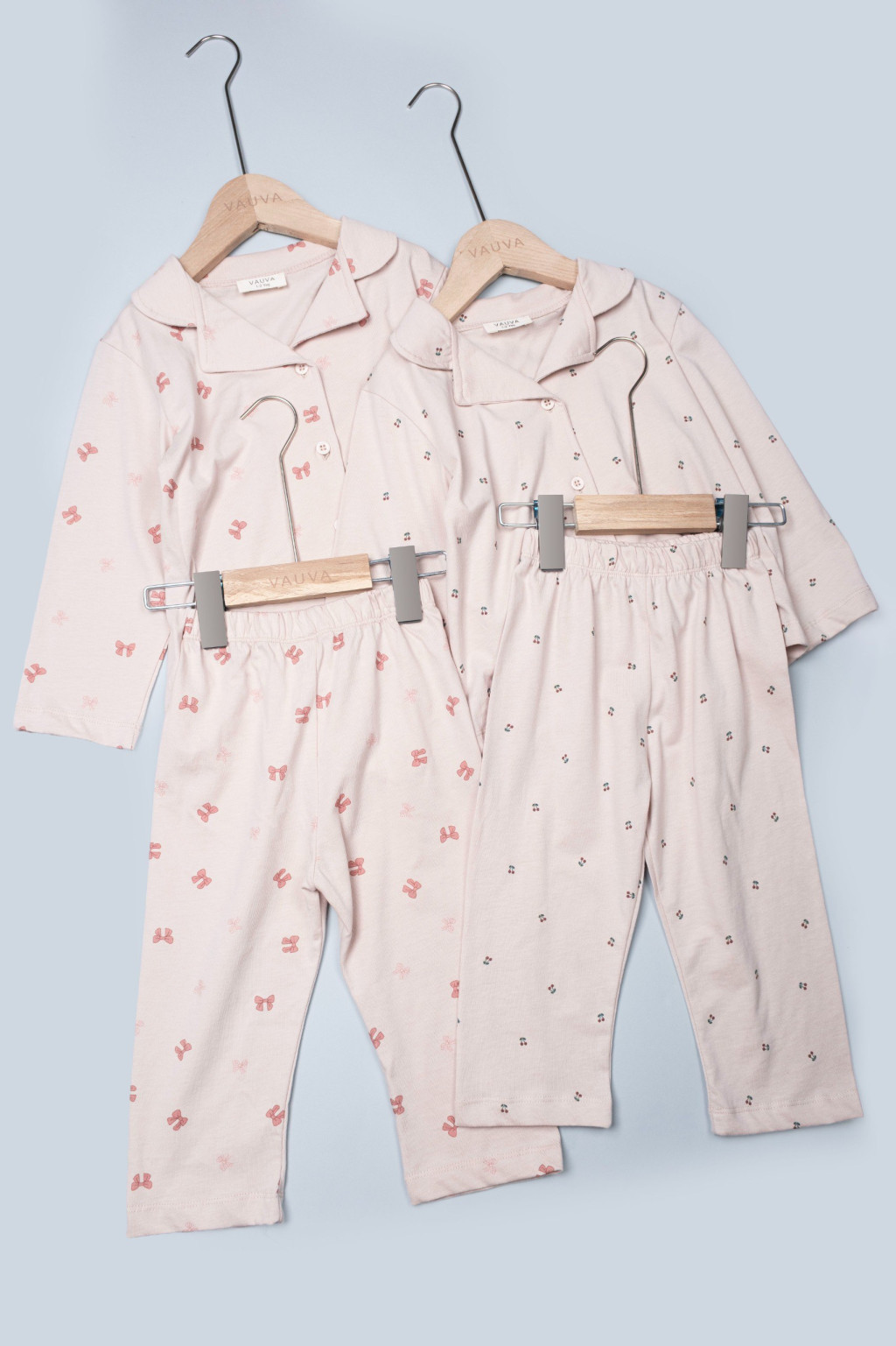 Kényelmes kislány pizsama galléros, elöl gombos felsőrésszel és gumis derekú nadrággal.