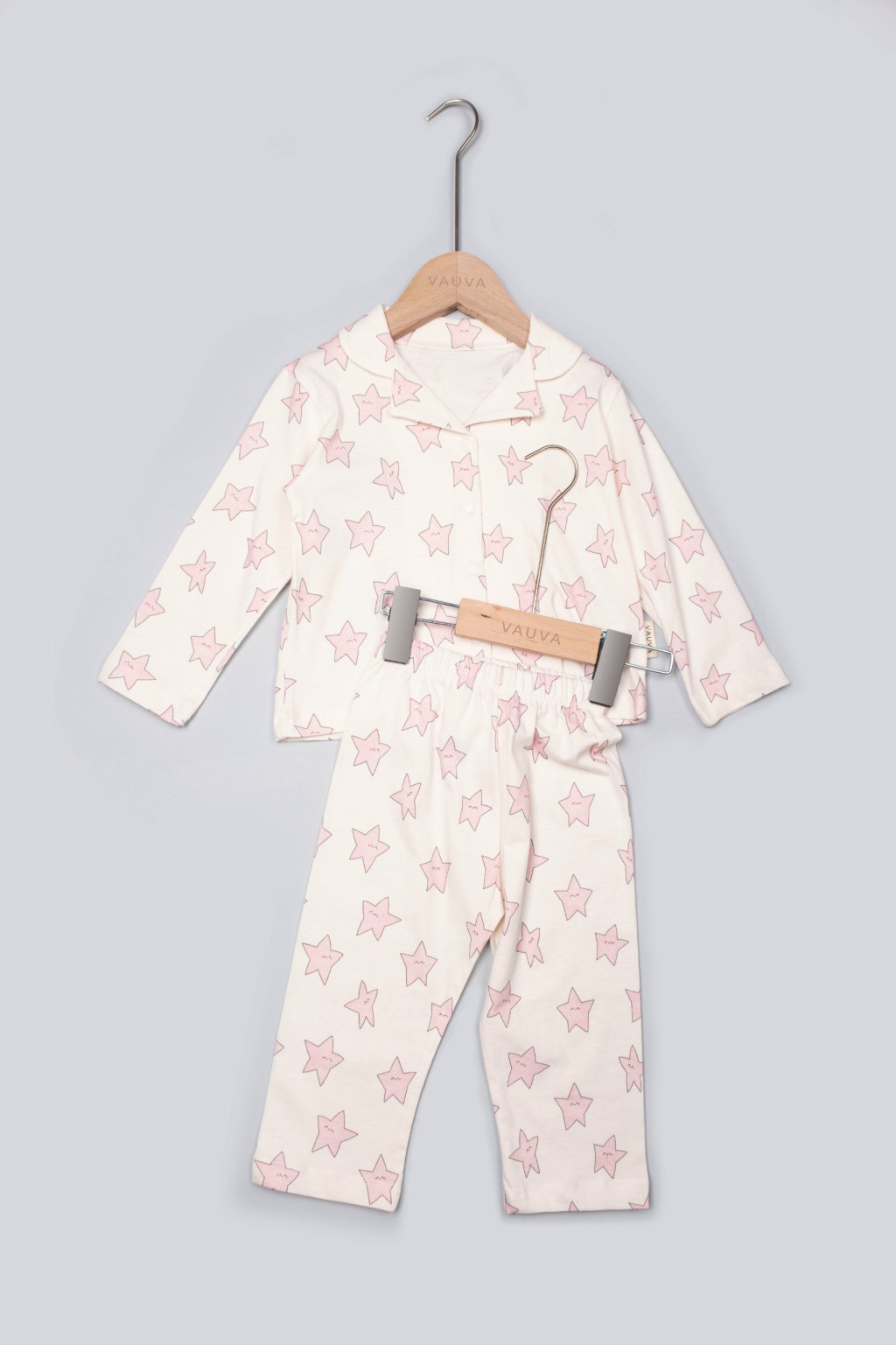 Galléros, elöl patentos kislány pizsama, gumis derekú nadrággal, csillag mintával.