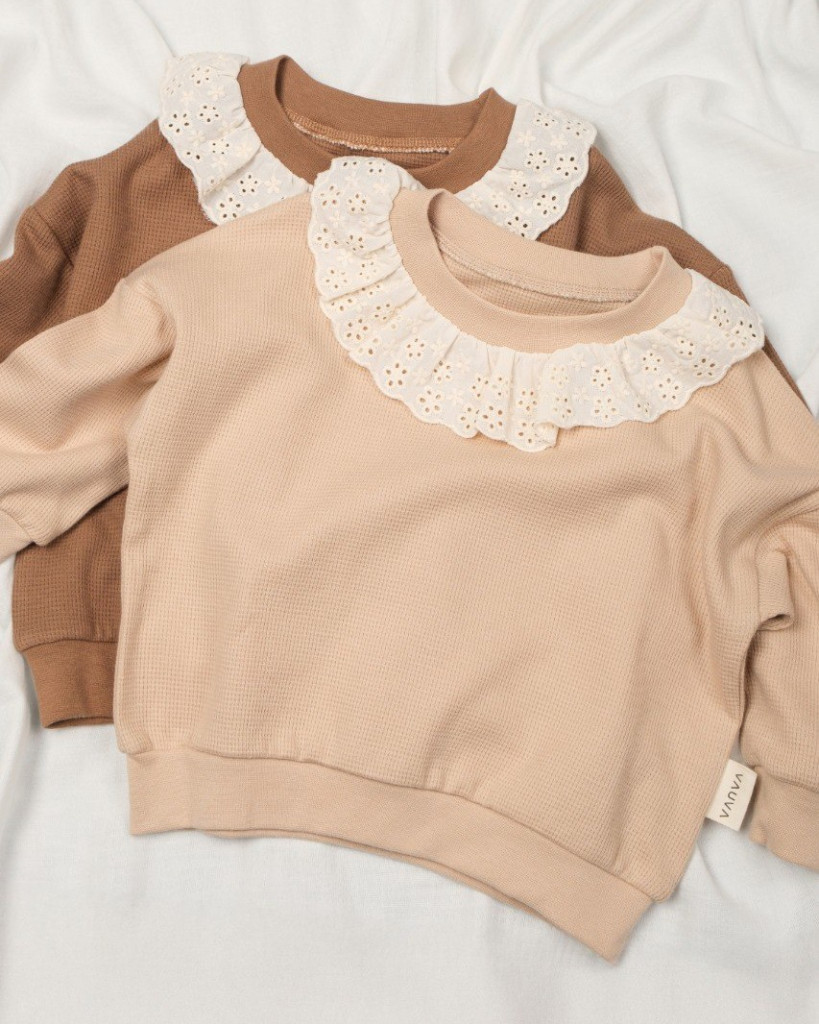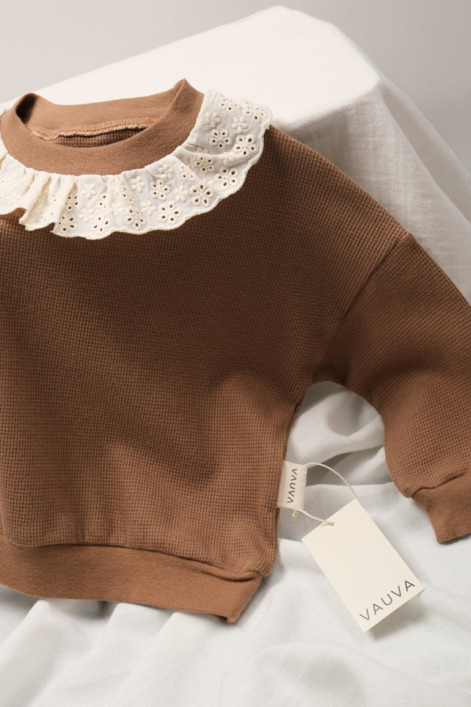 Csipkeszegélyes kislány sötétbarna színű pulóver. Krém és világosbarna színben is elérhető.