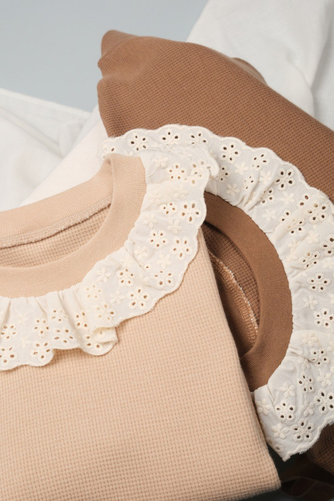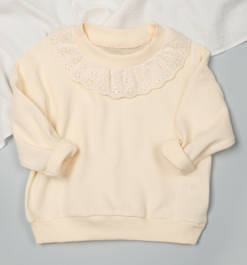 Csipkeszegélyes kislány pulóver krém színben. Barna színben is elérhető.