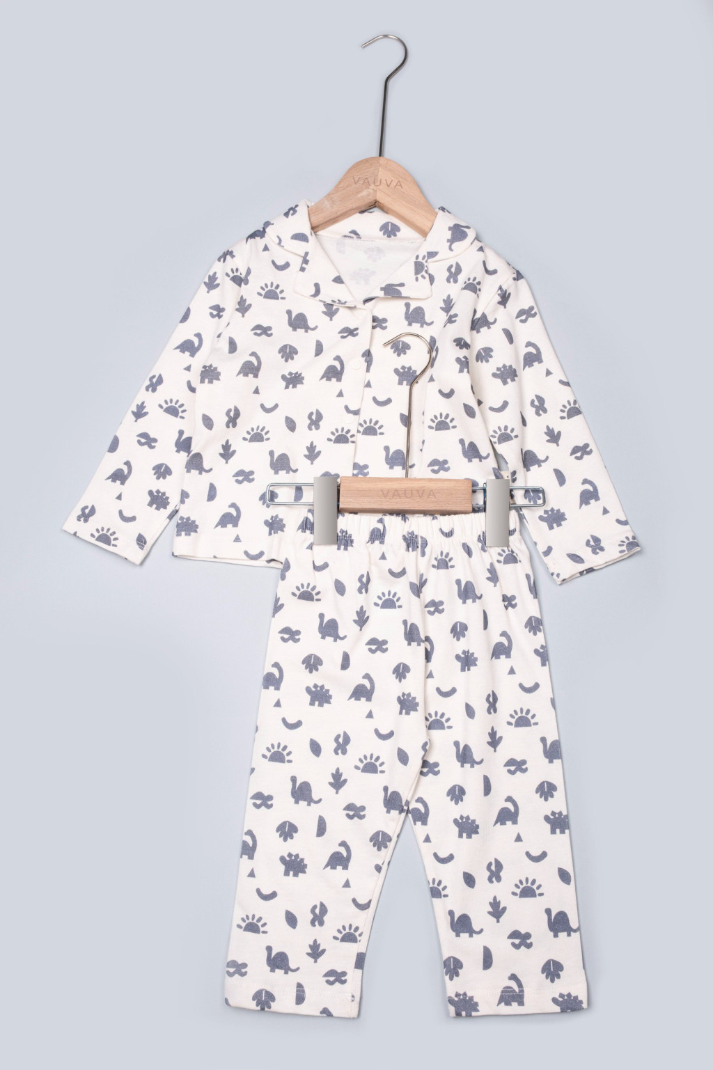 Galléros, elöl patentos baba pizsama, gumis derekú nadrággal, dinó mintával.