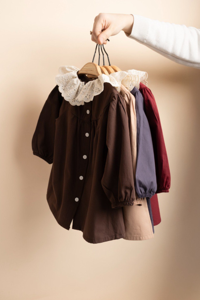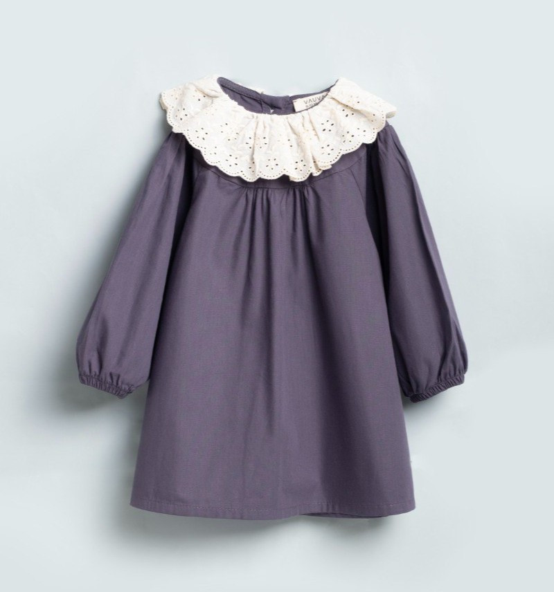 Elegáns babaruha lila színben, csipkés gallérral, hátul végig gombos megoldással, az ujjak alján gumírozott szegéllyel. Világosbarna színben is elérhető.