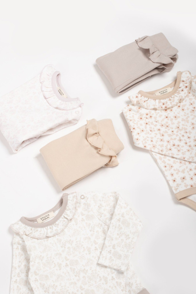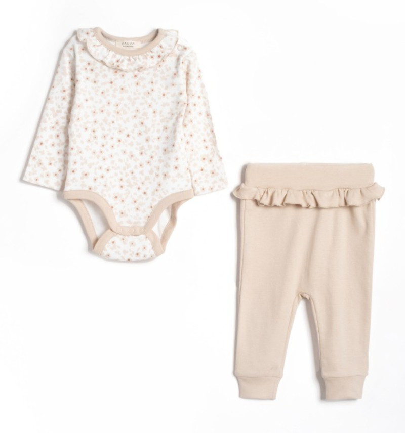 Bájos, 2 részes szett fodros részletekkel, patentos kombidresszel és kényelmes, passzés nadrággal. A hosszú ujjú kombidressz mintás anyagból készült, nyakrésze fodros díszítést kapott, vállnál és a lábak között patentos kialakítása segíti a könnyű öltöztetést. A hozzá illő nadrág derekán fodros részlettel, szárán pedig passzés kialakítással készült, így kényelmes viseletet biztosít a babának. Lila és vizon (szürkésbarna) színben is elérhető.