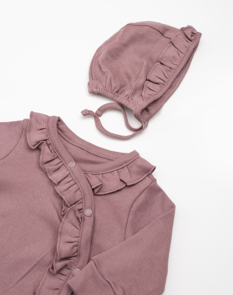 Fodros hosszú ujjú baba rugdalózó sapkával