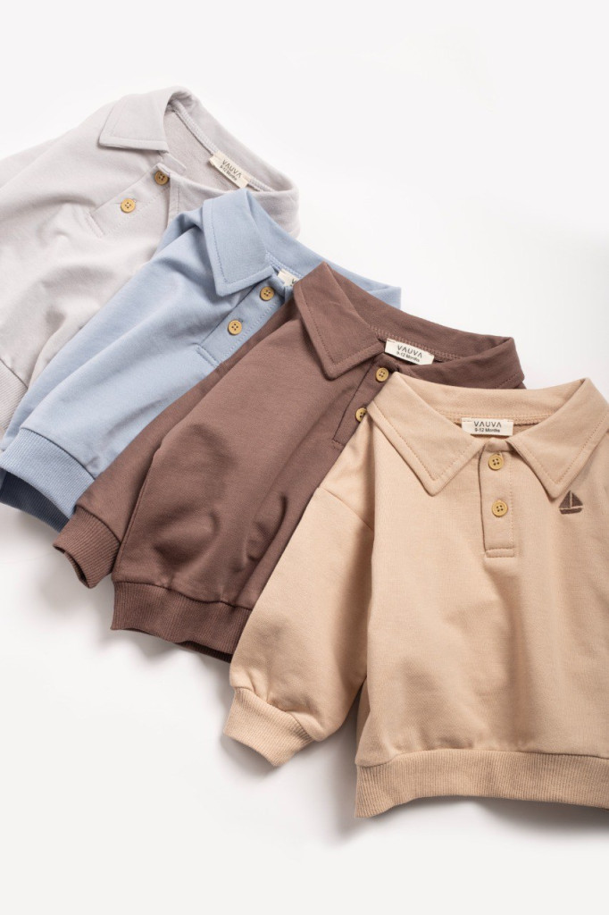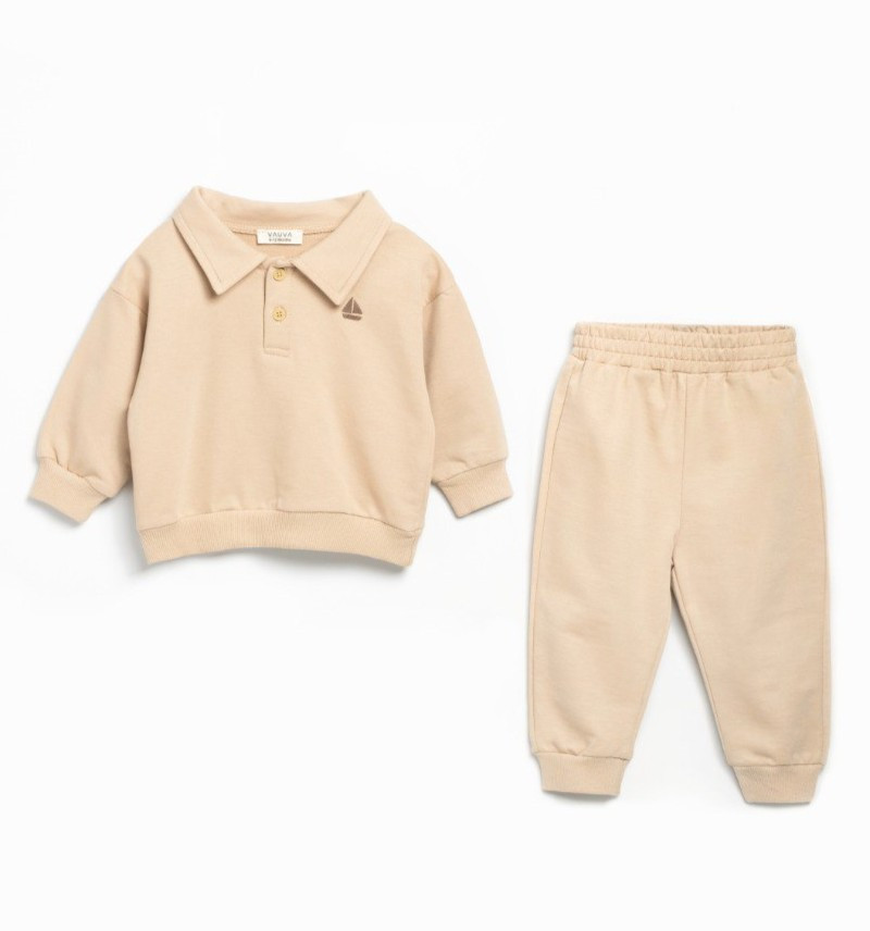 Galléros, elöl gombos kétrészes baba szett, a mellrészén hímzett díszítéssel. Pamut anyagból készült, puha és kényelmes viselet, gumis derekú nadrággal.