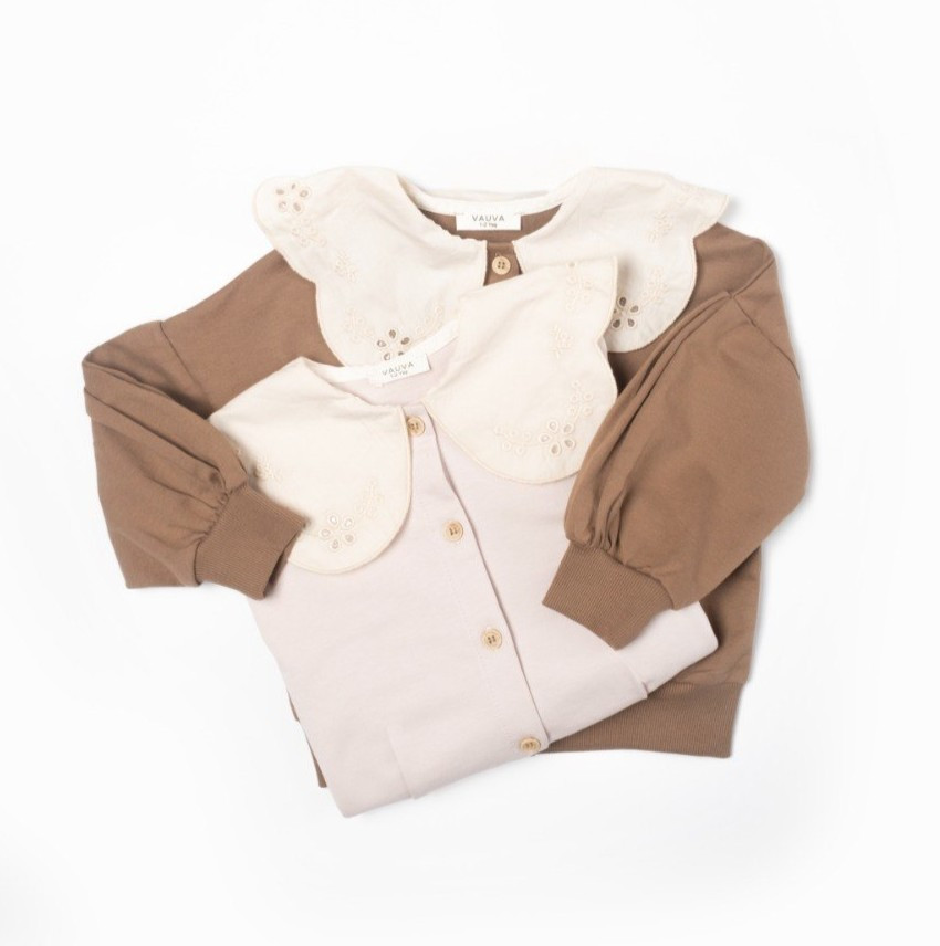 Elegáns, hímzett galléros kardigán púder színben, kislányok számára. Barna színben is elérhető.