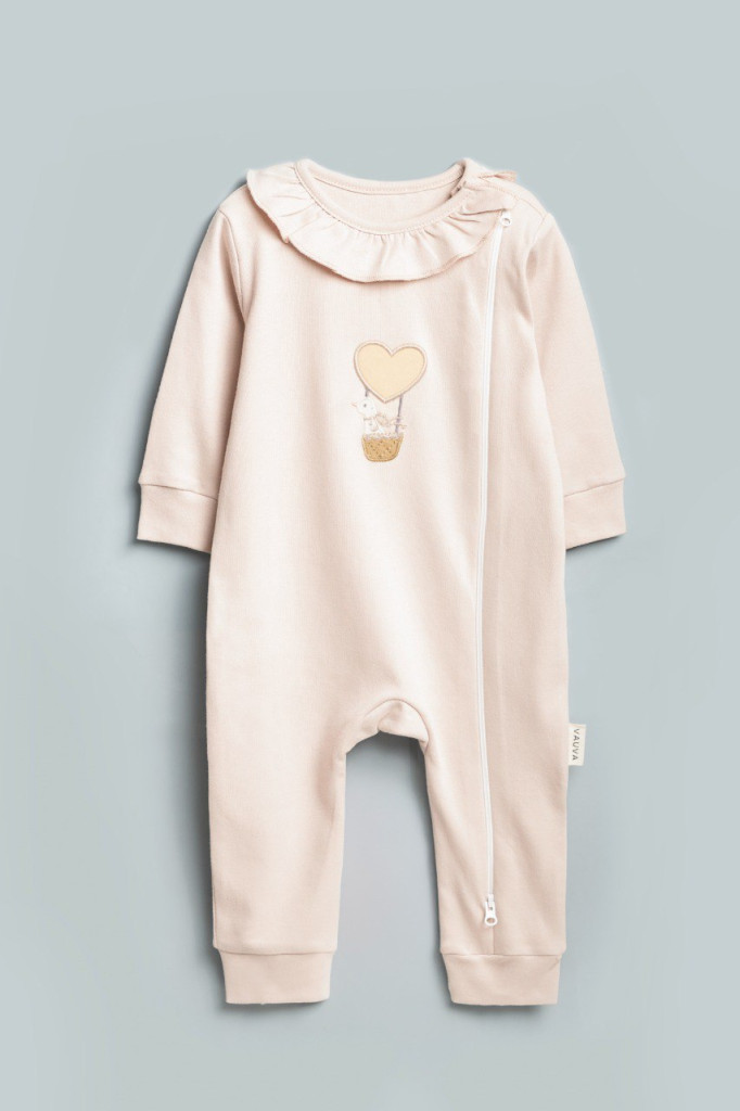 Kényelmes, elöl végig cipzáros rugdalózó fodros nyakrésszel, nyakrészen patentos záródással és az elején hímzett díszítéssel. Bézs és fehér színben is elérhető.