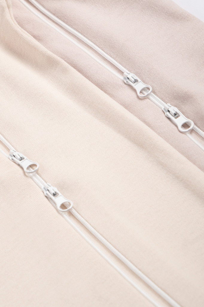 Elöl végig cipzáros, a nyaknál patentos, lábfej nélküli, a szár alja passzés, az ujj alja passzés