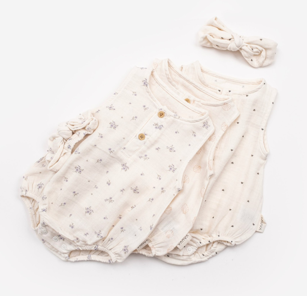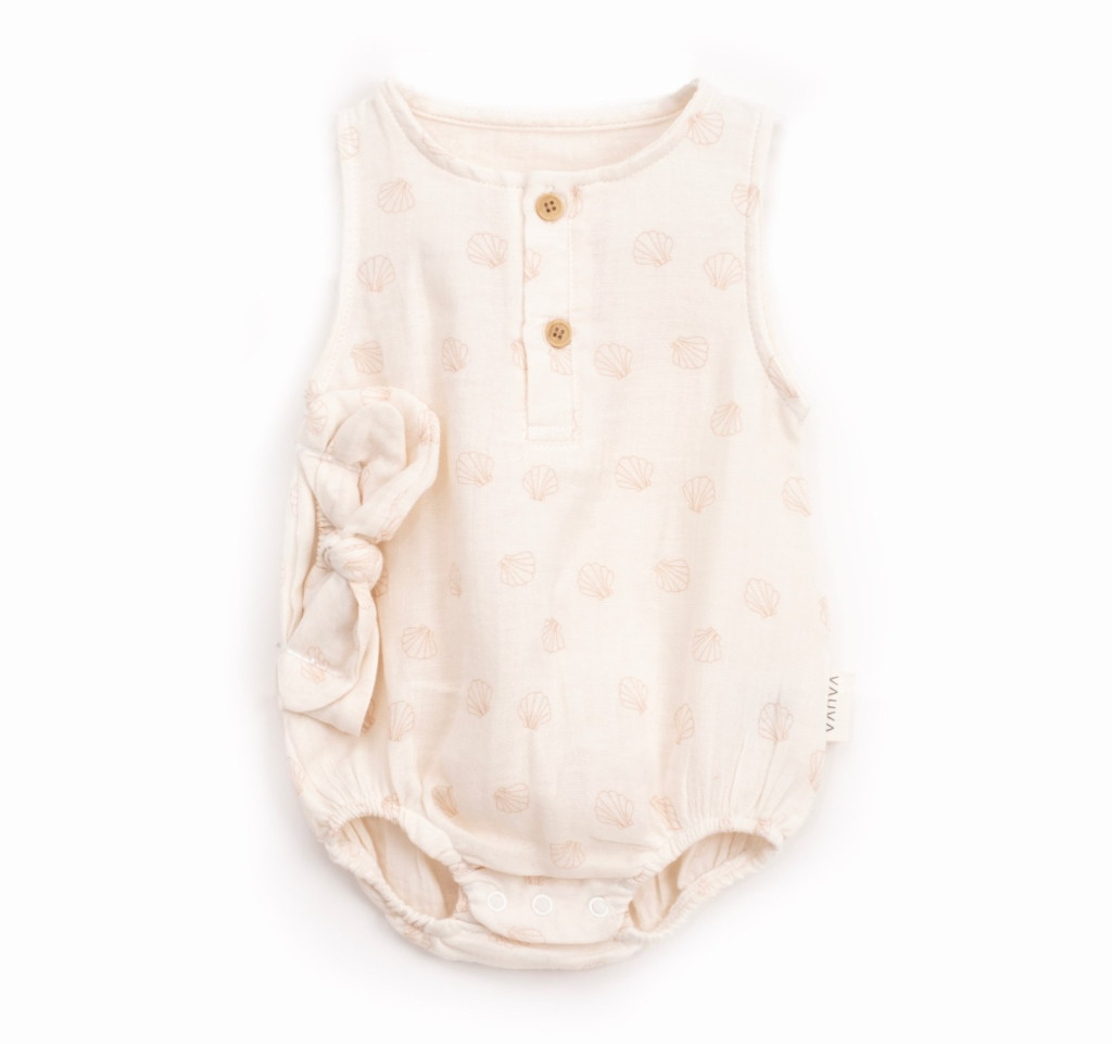 Könnyű, kényelmes muszlin baba napozó kagyló mintával és hozzá illő masnis fejpánttal.