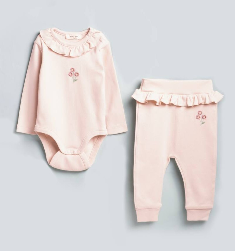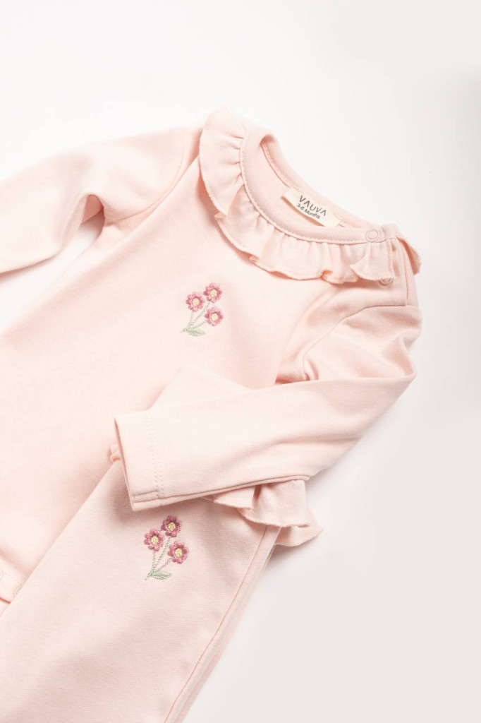 Kétrészes pamut baba szett fodros nyakú kombidresszel és derékrészen fodros nadrággal, virág hímzéssel díszítve. Lazacszínben és lila színben is elérhető.