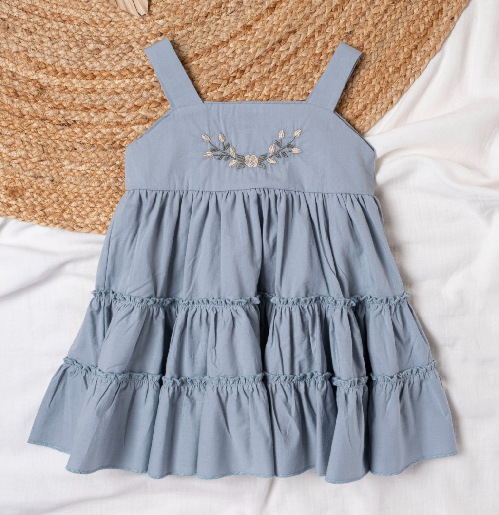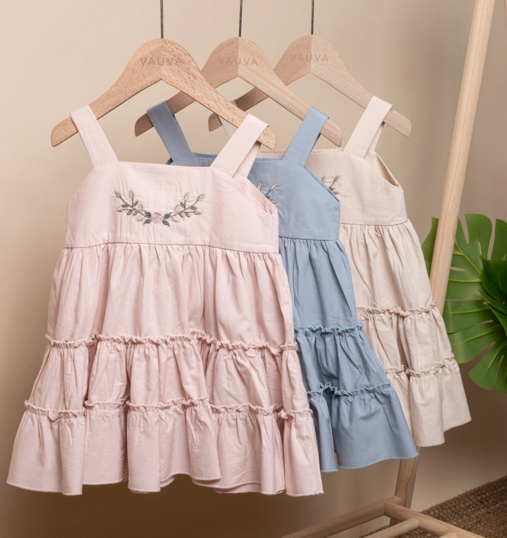 Könnyű, kényelmes pamut popelin ujjatlan kislány ruha finom hímzéssel, hátul gombos kialakítással. Kényelmes és csinos viselet a nyári napokra. Rózsaszín és bézs színben is elérhető.