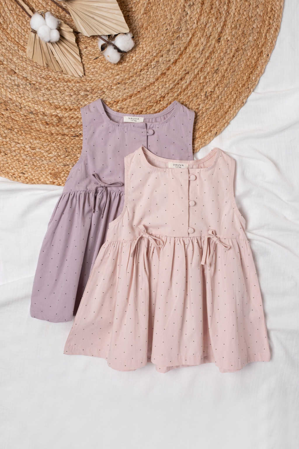 Pöttyös kislány ruha kiváló minőségű popelin anyagból készült. Ujjatlan kialakítása kényelmes és szellős viseletet biztosít. A mellrészt a ruha anyagával bevont gombok díszítik, melyeket az elején elhelyezett két dekoratív masni tesz igazán különlegessé. A ráncolt, bő szoknyarész kényelmes mozgást biztosít. Tökéletes választás melegebb napokra. Rózsaszínben is elérhető.