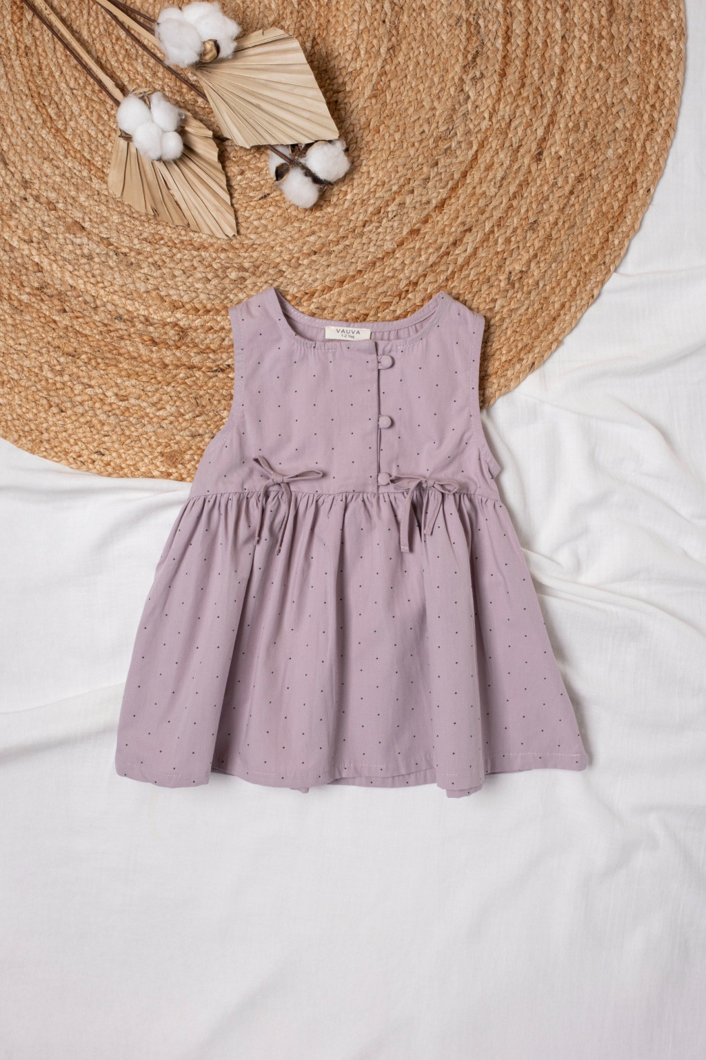 Pöttyös kislány ruha kiváló minőségű popelin anyagból készült. Ujjatlan kialakítása kényelmes és szellős viseletet biztosít. A mellrészt a ruha anyagával bevont gombok díszítik, melyeket az elején elhelyezett két dekoratív masni tesz igazán különlegessé. A ráncolt, bő szoknyarész kényelmes mozgást biztosít. Tökéletes választás melegebb napokra. Rózsaszínben is elérhető.Rózsaszínben is elérhető.