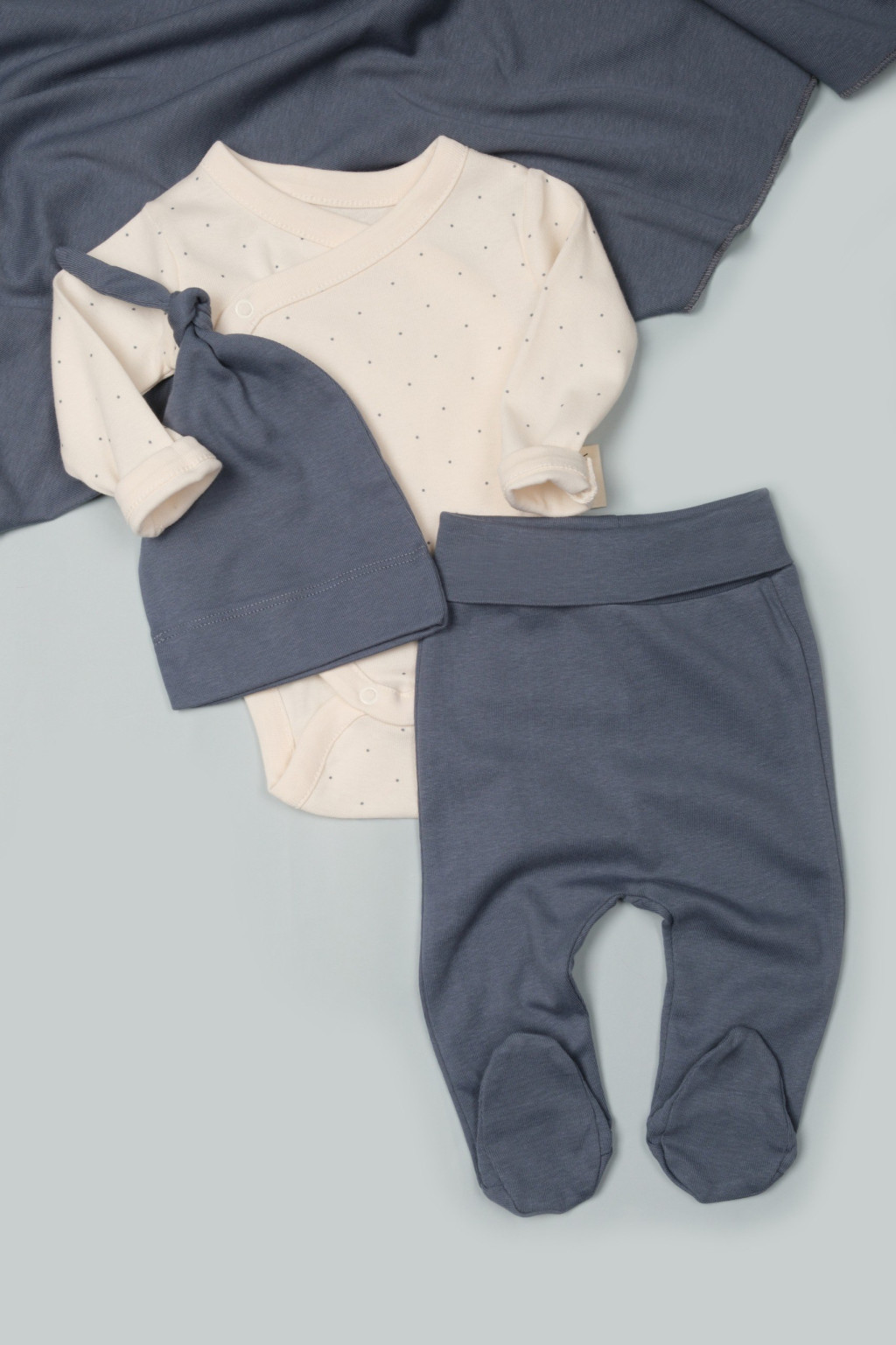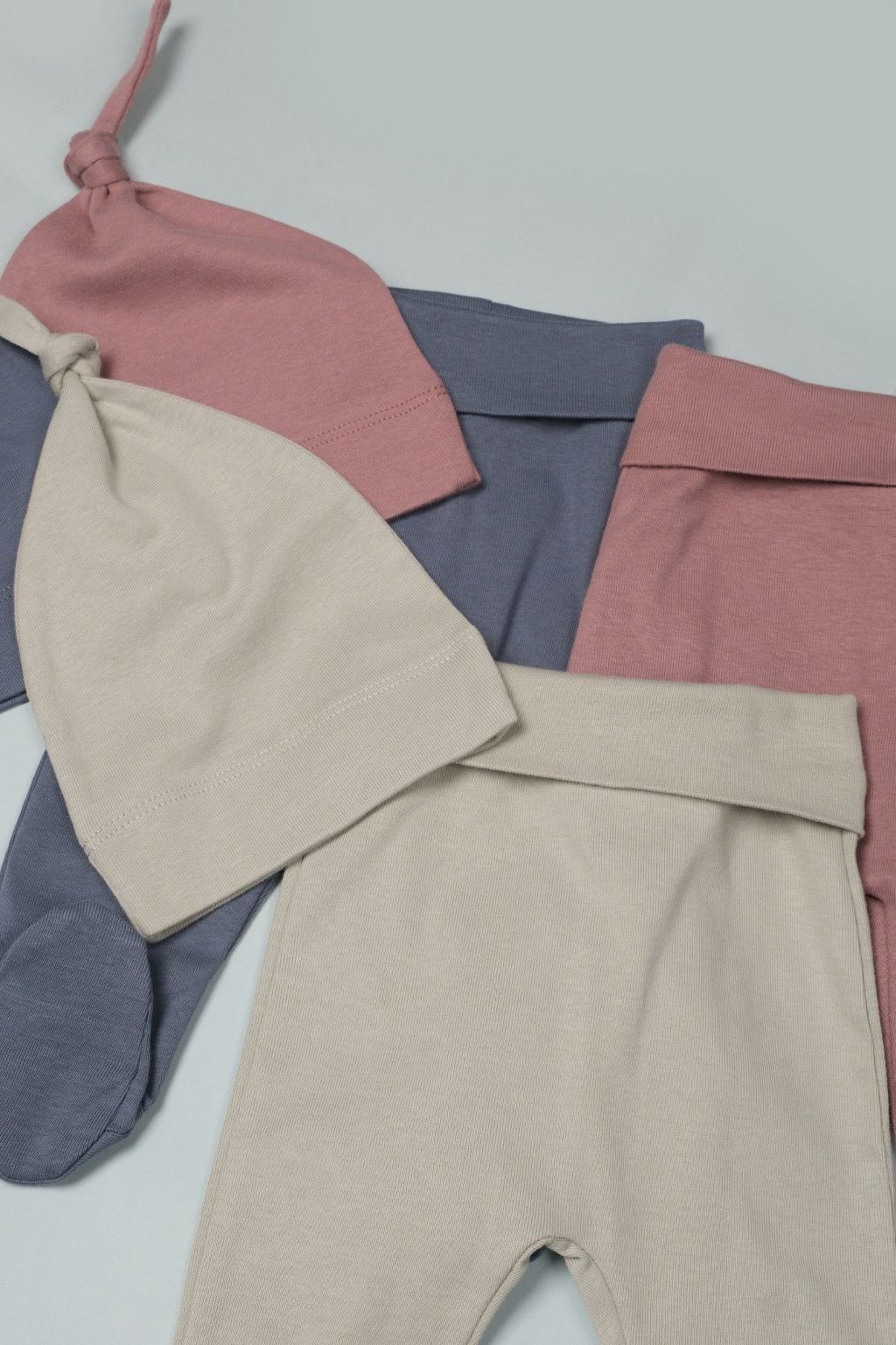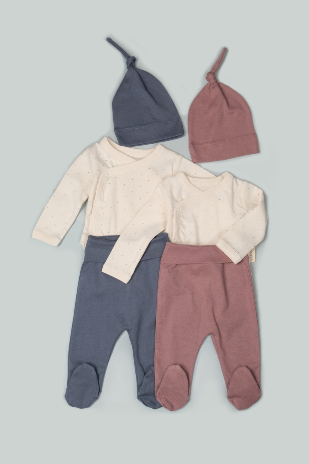 Apró pöttyös kombidressz indigókék színű nadrággal és sapkával. Mályvarózsaszín és világoszöld színben is elérhető.